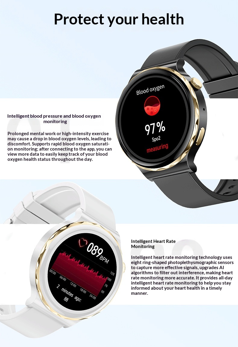 Functions: Photography, Step Counting, Heart Rate Monitoring, Blood Pressure Measurement, Social Entertainment, Bluetooth Call, Smart Reminder, Remote Selfie, Sleep Monitoring, Blood Oxygen Detection