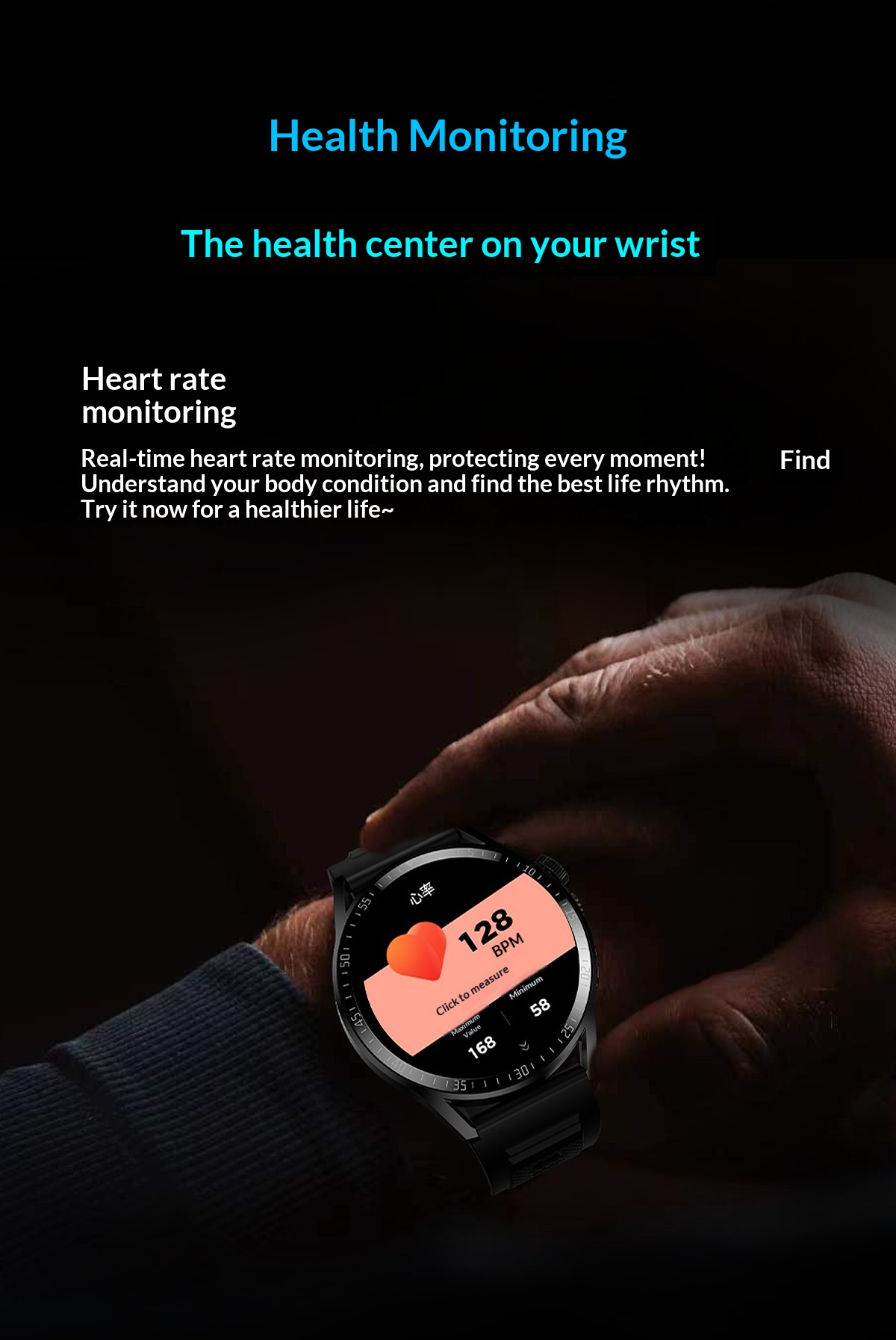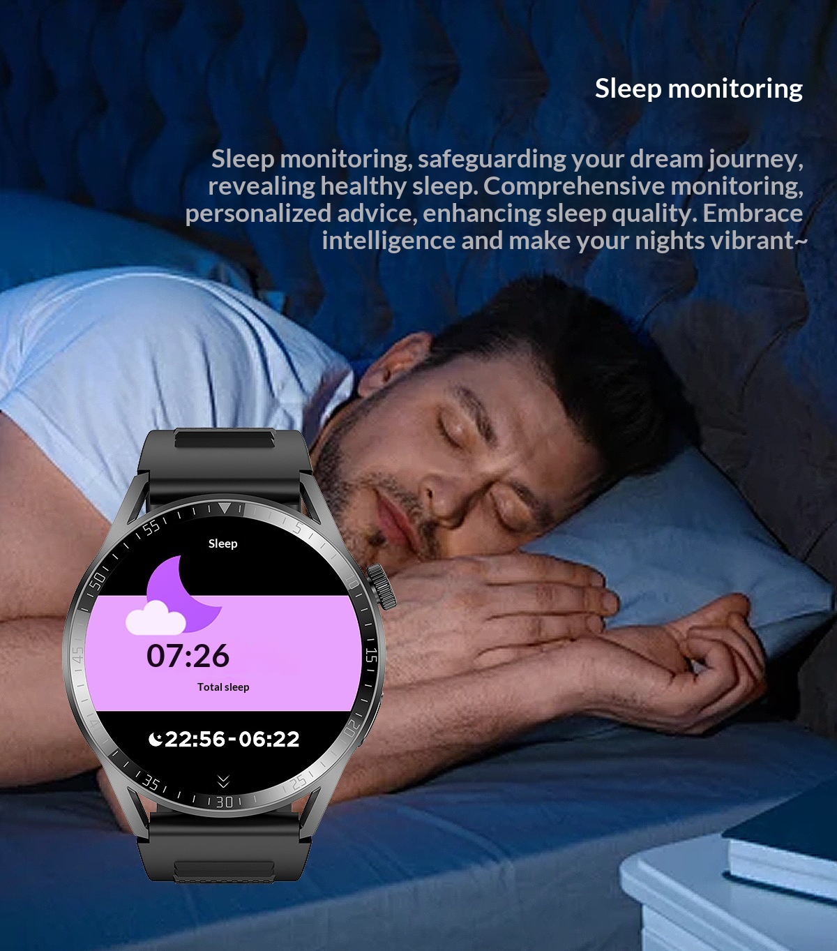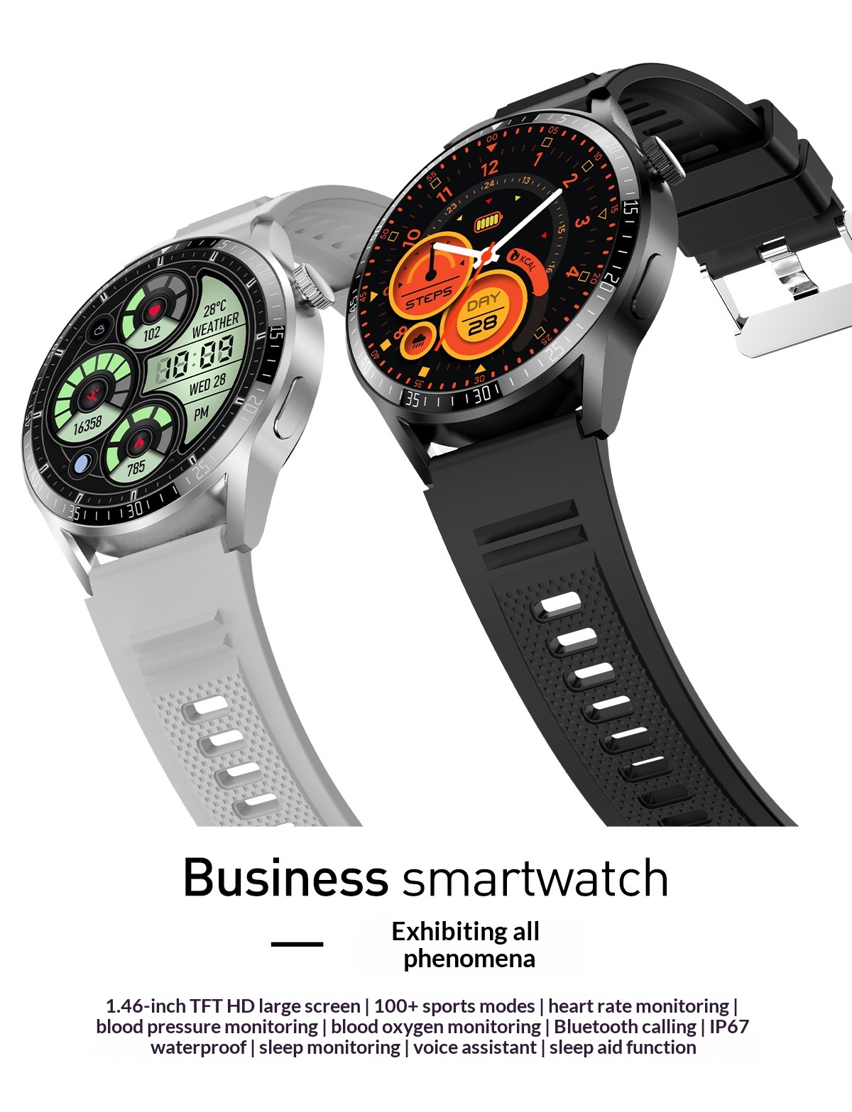 Function: waterproof, step counting, heart rate monitoring, blood pressure measurement, social entertainment, Bluetooth call, intelligent reminder, remote selfie, sleep monitoring, blood oxygen detection